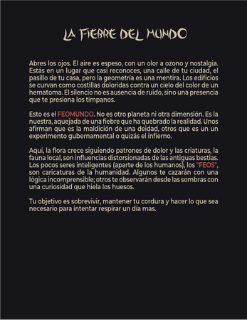 Abres los ojos. El aire es espeso, con un olor a ozono y nostalgia. Estás en un lugar que casi reconoces, pero la geometría es una mentira... Feomundo es un juego de rol narrativo y solitario en el que tu único objetivo es sobrevivir un día más en una versión febril y rota de nuestra propia realidad. Usando una baraja de cartas española, dados de cuatro caras y un diario, explorarás lugares retorcidos, te enfrentarás a las caricaturas de la humanidad conocidas como "FEOS" y lucharás por mantener tu cordura.